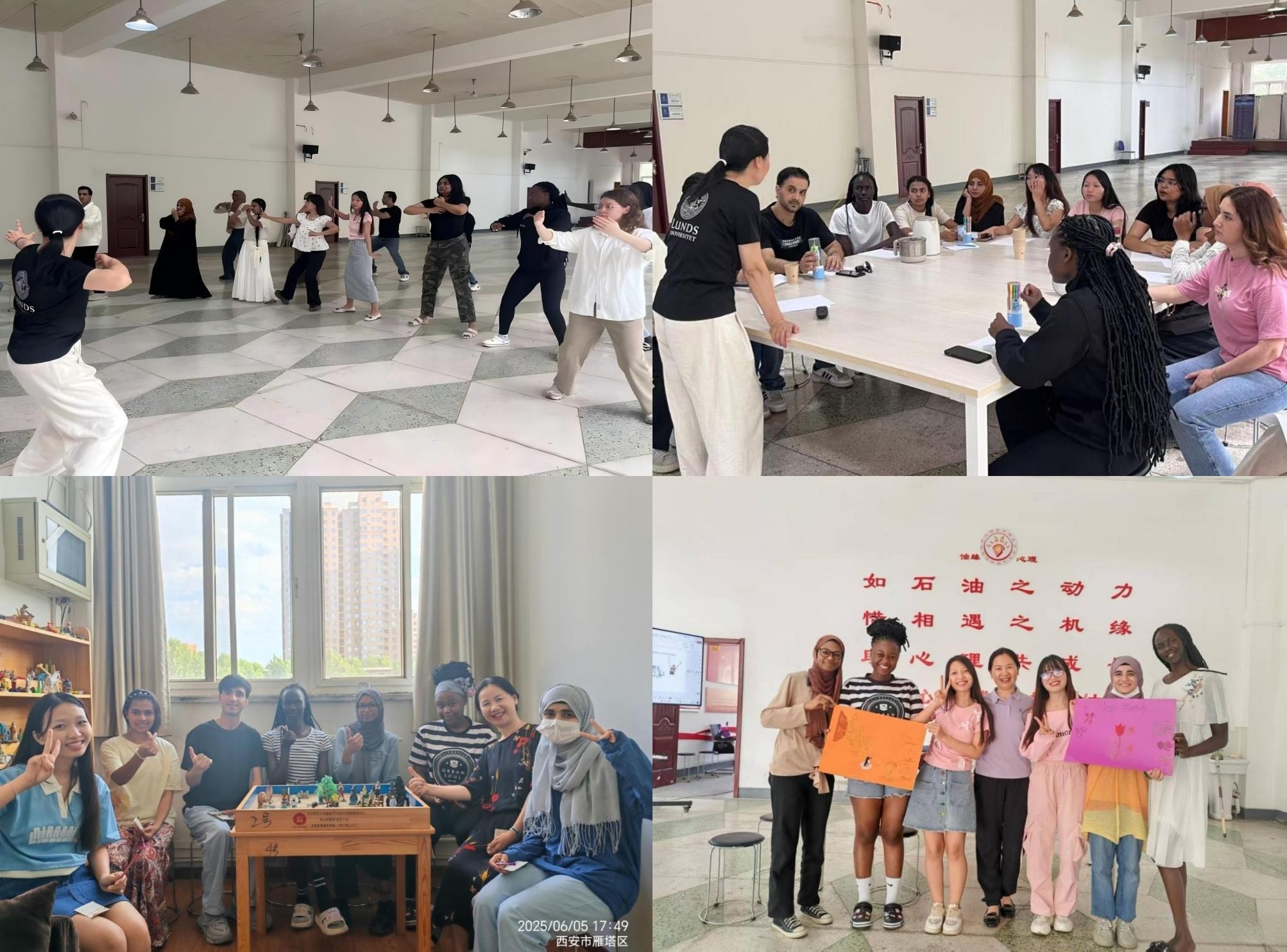 本期工作坊基于跨文化心理學(xué)相關(guān)理論,專(zhuān)為提升國(guó)際學(xué)生心理適應(yīng)能力而設(shè)計(jì)。活動(dòng)圍繞“相遇在西安石油大學(xué)”“積極心態(tài)的構(gòu)建”“適應(yīng)過(guò)程中的挫折與成長(zhǎng)”“期待與祝?!彼膫€(gè)主題開(kāi)展。每場(chǎng)工作坊均以中國(guó)傳統(tǒng)健身氣功八段錦開(kāi)場(chǎng)熱身,引導(dǎo)參與者分享個(gè)人文化背景與在校經(jīng)歷,并通過(guò)建立積極心態(tài)、尋求社會(huì)支持、實(shí)現(xiàn)自我成長(zhǎng)、共繪發(fā)展愿景等環(huán)節(jié)進(jìn)行敘事重構(gòu),切實(shí)提升國(guó)際學(xué)生的跨文化心理適應(yīng)能力。