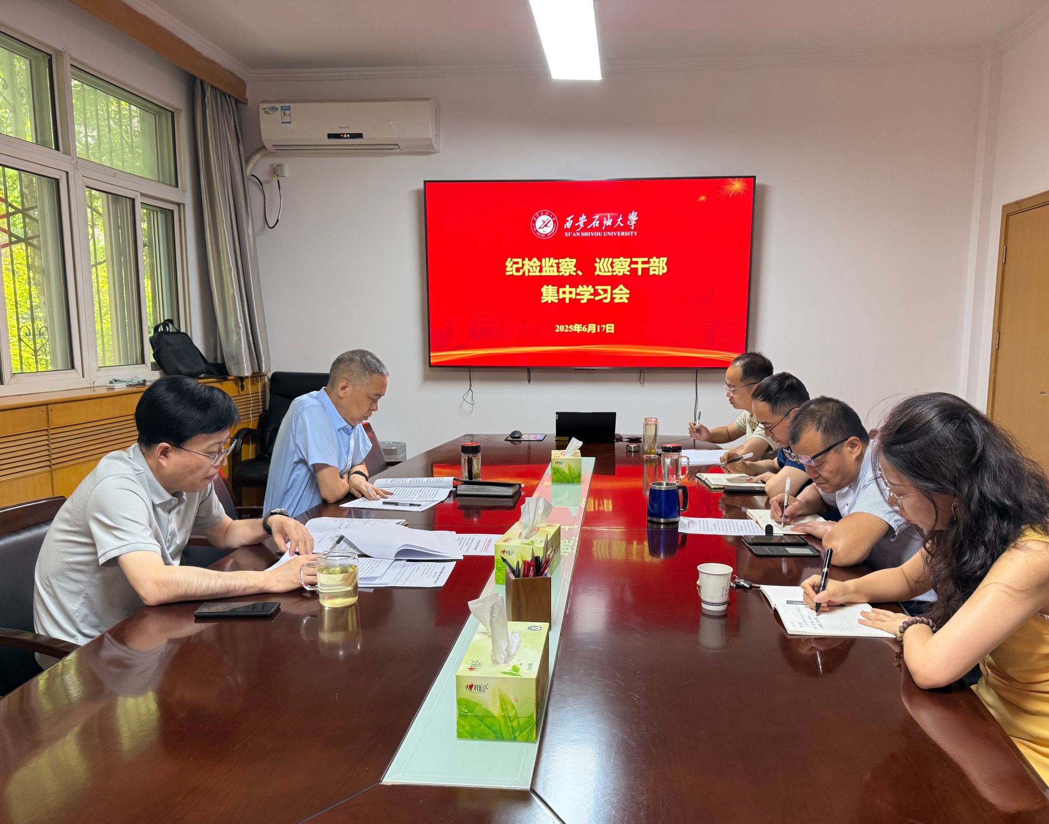 6月17日上午,紀檢巡察干部2025年第13次集中學習會在雁塔校區(qū)辦公樓二樓會議室召開,紀檢監(jiān)察機構、黨委巡察工作辦公室全體干部參加。會議由校黨委副書記、紀委書記、監(jiān)察專員王輝強主持。