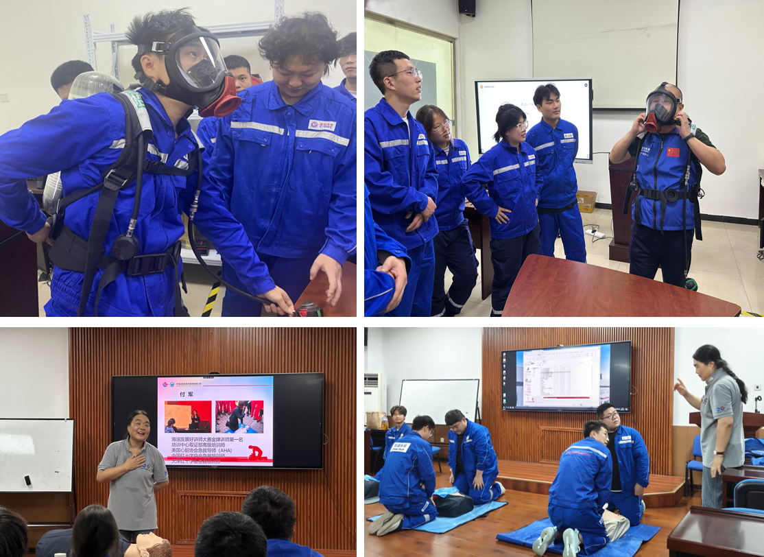 教學團隊圍繞“海上油田安全優(yōu)先”,講解安全用具使用與維護,演示正壓式空氣呼吸器等裝備穿戴;結合案例引導學生多維度評估海上平臺風險,樹立“預防為先”理念。而后的應急技能培訓則側(cè)重實戰(zhàn),學生分組演練心肺復蘇術(CPR)與自動體外除顫儀(AED)操作,并模擬煙熱環(huán)境中的火災逃生,強化應急自救能力。