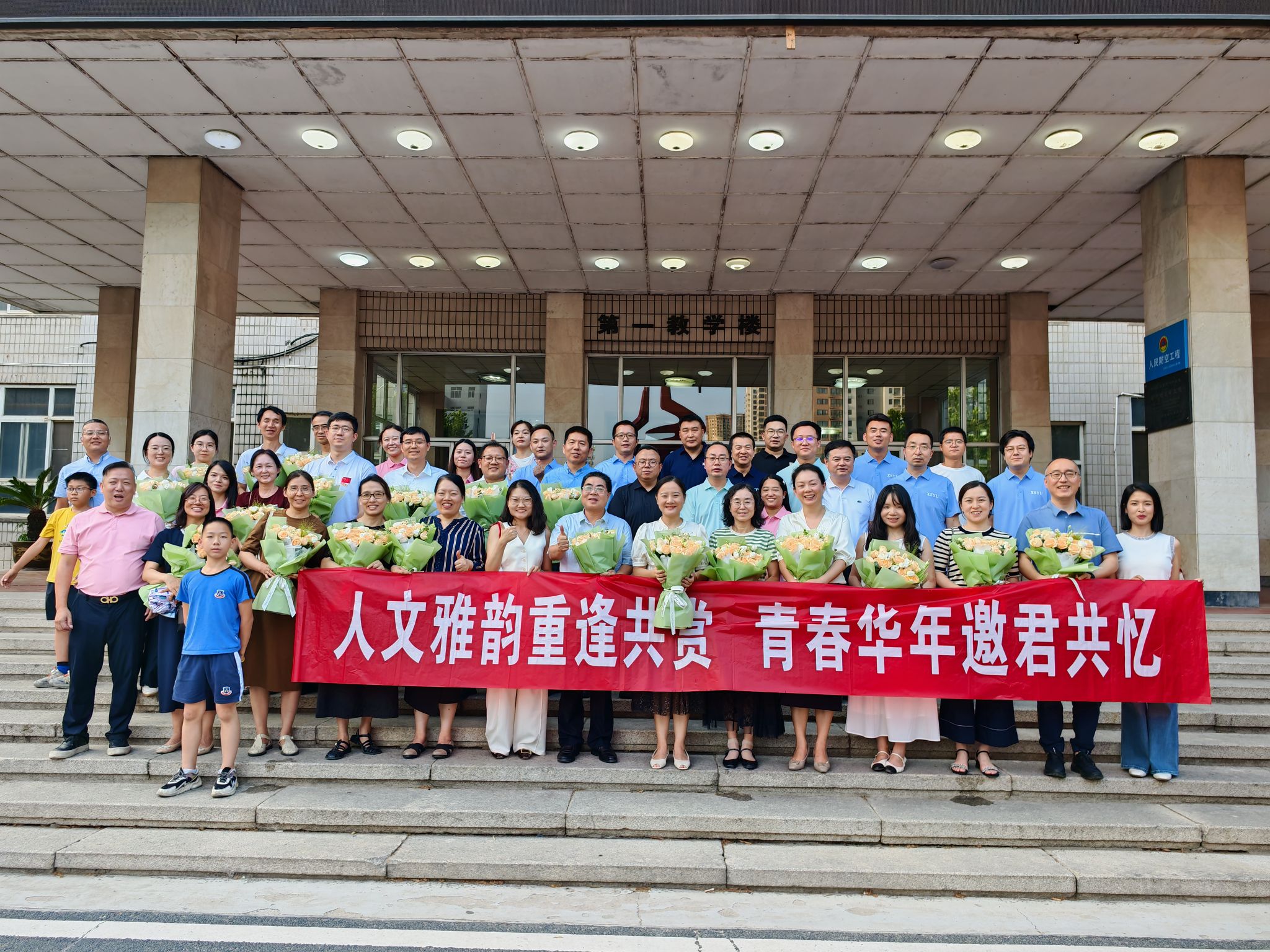 合影。2002級(jí)漢語言文學(xué)專業(yè)校友代表劉凱揚(yáng)為全體教師獻(xiàn)花,與會(huì)人員在教學(xué)樓前合影留念,鏡頭定格下了這難忘的一刻。每個(gè)人的臉上都洋溢著幸福的笑容,那是對(duì)過去美好時(shí)光的懷念,也是對(duì)未來共同發(fā)展的期待。
