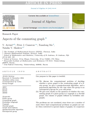 發(fā)表在Journal of Algebra的論文“Aspects of the commuting graph”主要研究了有限群的交換圖,全文共61頁,作者順序按姓氏字母排列,依次為印度欽奈數(shù)學(xué)研究所V. Arvind教授、英國圣安德魯斯大學(xué)Peter J. Cameron教授、理學(xué)院馬儇龍副教授及俄羅斯科學(xué)院烏拉爾分院克拉索夫斯基數(shù)學(xué)和力學(xué)研究所首席研究員Natalia V. Maslova教授。群上交換圖的研究最早起源于1955年,本文系統(tǒng)探討了判定給定圖是否為有限群上交換圖的算法問題,且針對超特殊p-群(p為奇素?cái)?shù)),給出了多項(xiàng)式算法。此外,就“分類交換圖是余圖或弦圖時(shí)所對應(yīng)的有限群”這一公開問題進(jìn)行了深入研究;特別地,分類了交換圖為余圖時(shí)的所有有限單群。該工作得到了國家自然科學(xué)基金項(xiàng)目的大力支持和資助。