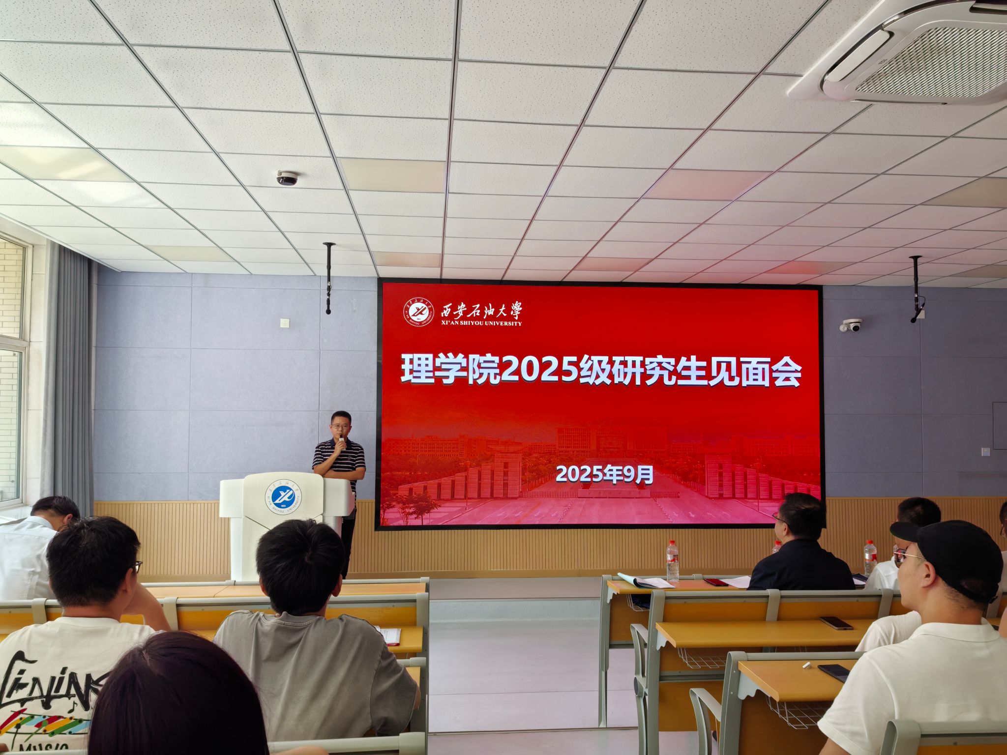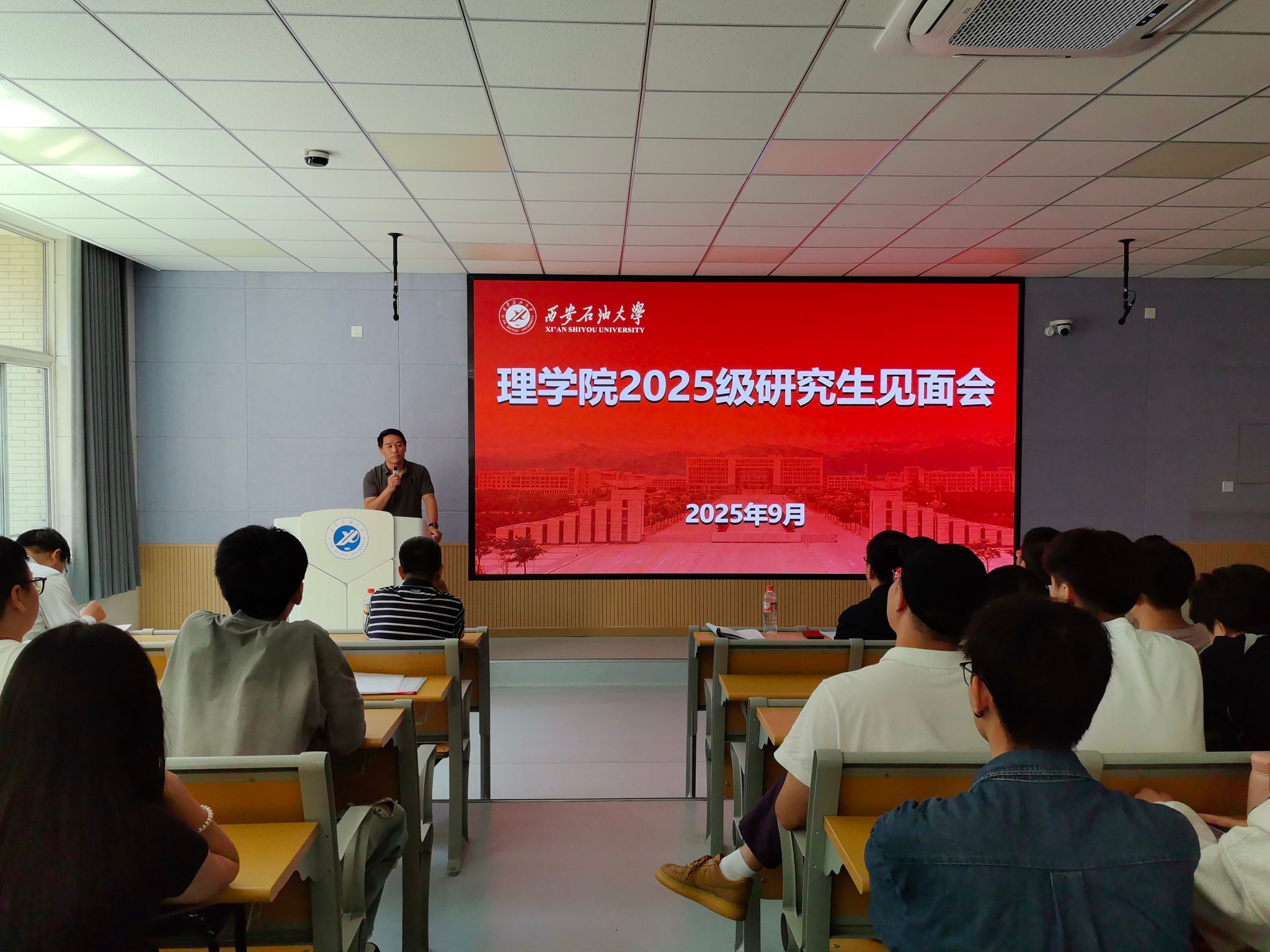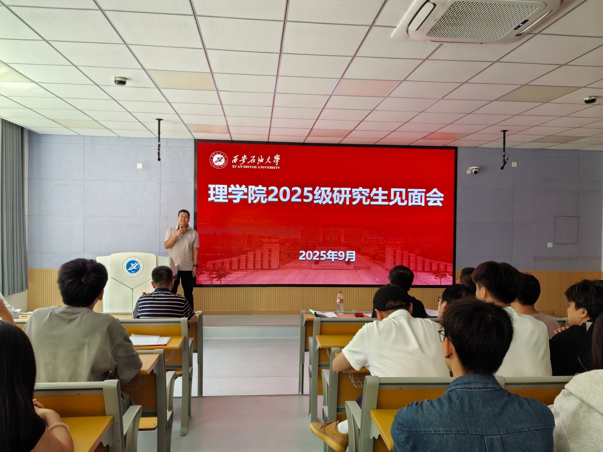 9月8日下午,理學(xué)院在鄠邑校區(qū)博覽樓A110室召開2025級碩士研究生見面會。學(xué)院黨委書記席利哲、院長折延宏、黨委副書記楊富民,副院長劉帥、馬儇龍,導(dǎo)師代表丁繼軍,研究生輔導(dǎo)員馬小梅及全體2025級碩士研究生參加了本次大會。會議由黨委副書記楊富民主持。