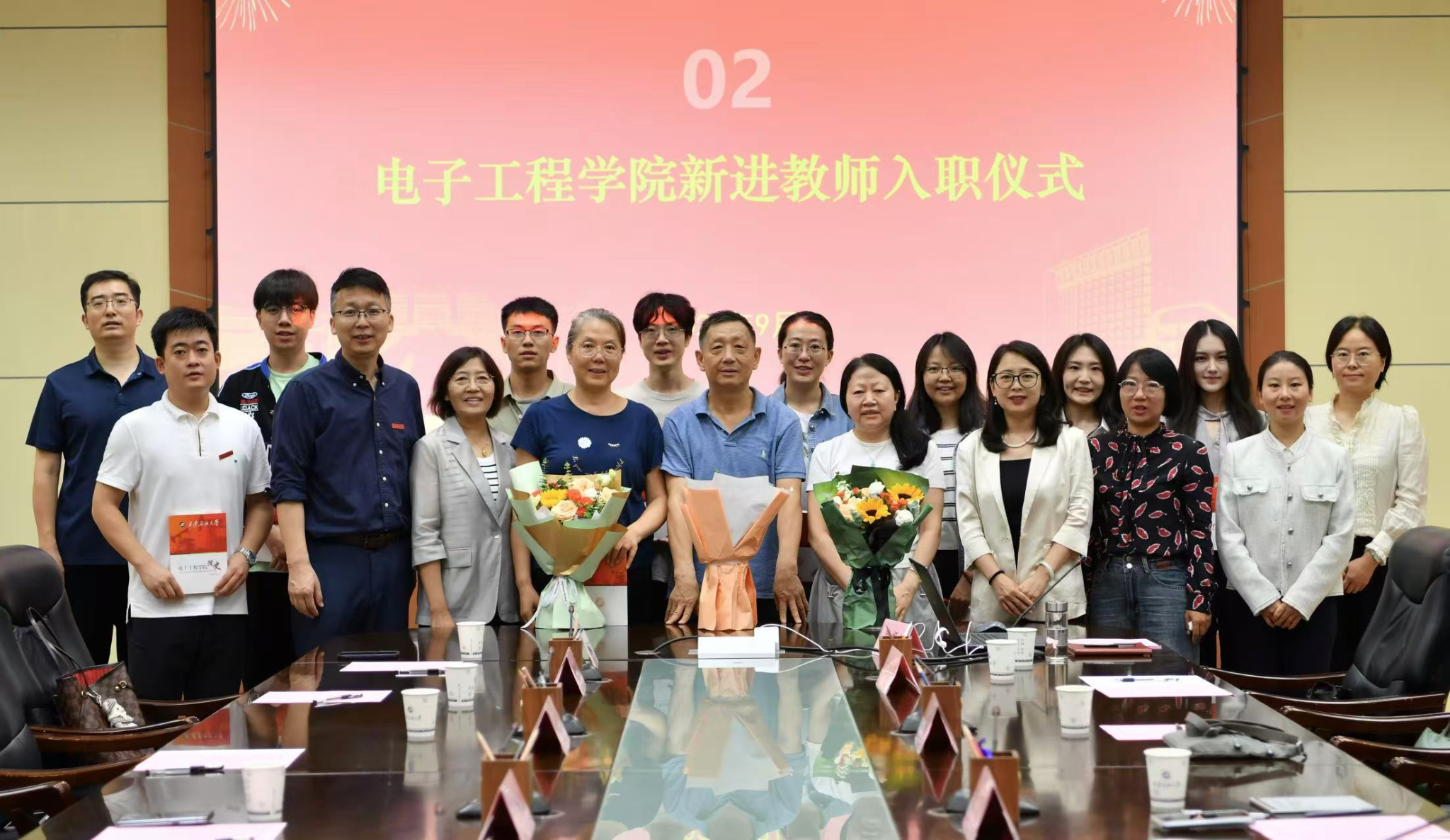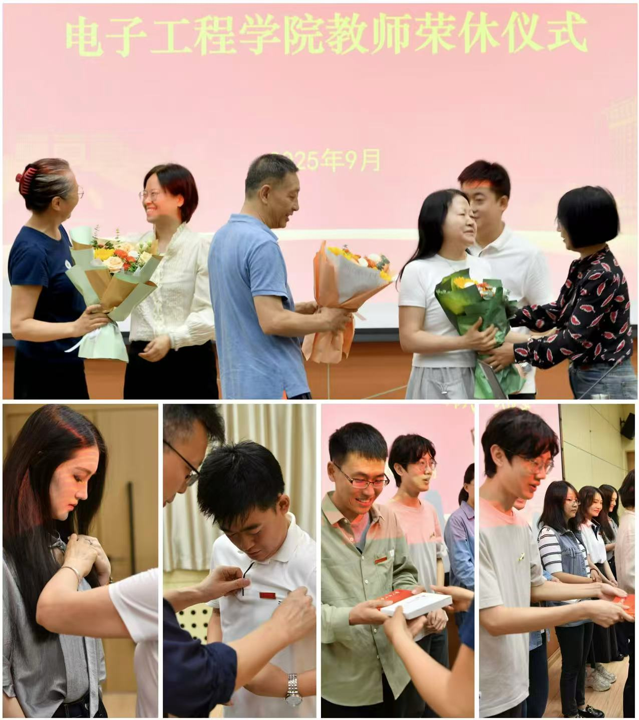 熱烈氛圍中,學院領導與榮休教師為青年博士佩戴校徽、贈送《電子工程學院院史》。榮休教師帶領全體參會老師重溫教師宣誓詞,以鏗鏘有力的誓言,承諾恪守師德、潛心育人、不忘初心、砥礪前行!