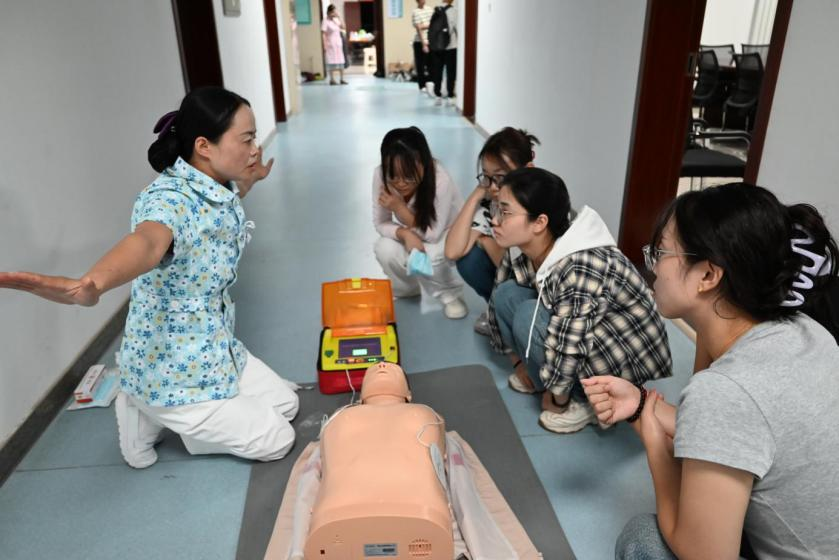 培訓以“技能操作”為核心內容,涵蓋心搏驟停現(xiàn)場對成人進行心肺復蘇和使用自動體外除顫器(AED)、氣道異物梗阻現(xiàn)場應用海姆立克急救法救助病患,以及緊急傷口包扎等實操技能的演示教學。