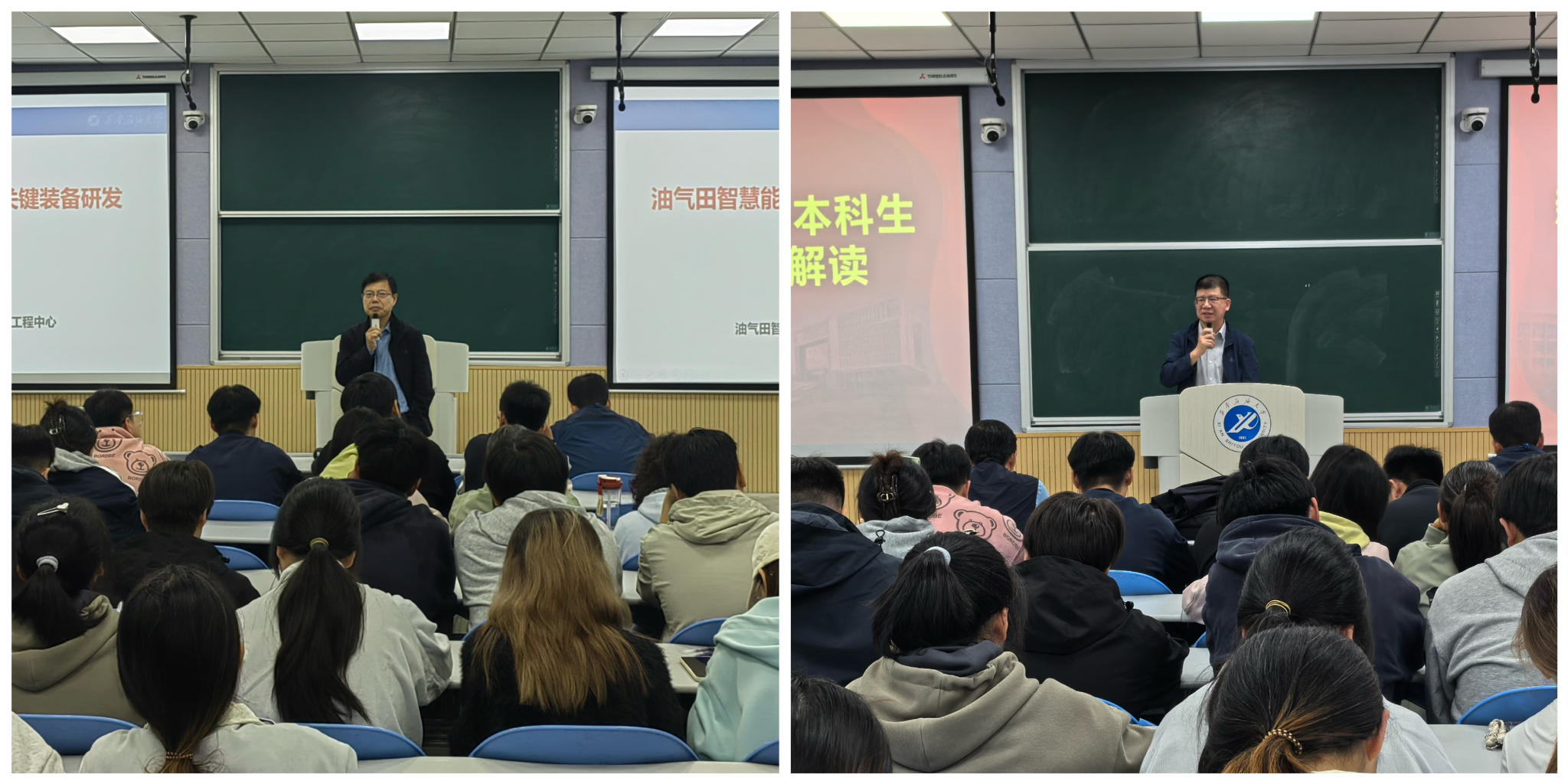 活動分為專題講座與面對面答疑交流兩個環(huán)節(jié)。在第一階段的專題講座中,副院長王治國教授結(jié)合自身科研教學(xué)實(shí)踐,為同學(xué)們作了題為“油氣田智慧能源系統(tǒng)構(gòu)建與關(guān)鍵裝備研發(fā)”的專題報告。他依托詳實(shí)的科研案例與前沿學(xué)術(shù)理論,系統(tǒng)闡述了油氣田智慧能源系統(tǒng)的發(fā)展趨勢與核心技術(shù),詳細(xì)介紹了構(gòu)建以新能源為主導(dǎo),集多源協(xié)同、智慧運(yùn)維、智慧儲能、智能材料、智能設(shè)備及智慧學(xué)習(xí)于一體的智慧能源系統(tǒng)的重要意義與實(shí)現(xiàn)路徑,拓寬了同學(xué)們的學(xué)術(shù)視野,激發(fā)了大家對專業(yè)領(lǐng)域深入探索的興趣與熱情。講座中還融入了關(guān)于新能源與傳統(tǒng)能源融合發(fā)展的見解,并為同學(xué)們未來求學(xué)考研規(guī)劃提供了實(shí)用建議。