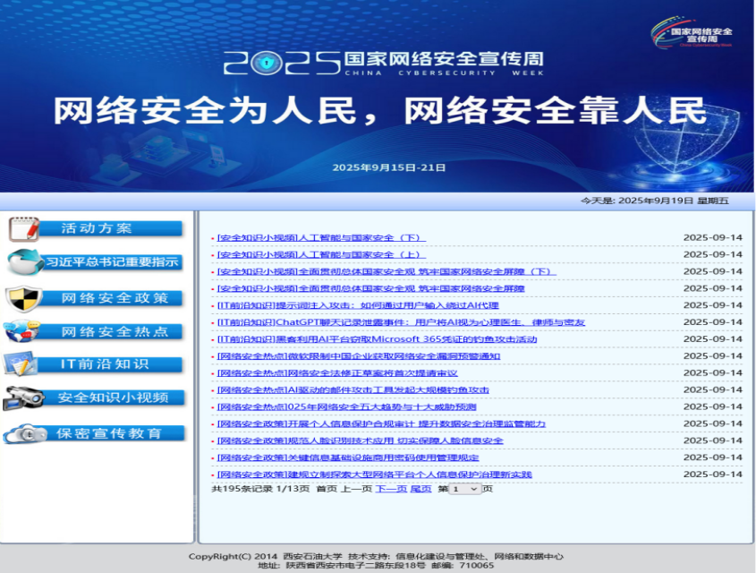 2025年9月15日至21日,西安石油大學(xué)圍繞“網(wǎng)絡(luò)安全為人民,網(wǎng)絡(luò)安全靠人民——以高水平安全守護(hù)高質(zhì)量發(fā)展”主題,組織開展第十二屆國家網(wǎng)絡(luò)安全宣傳周系列活動。此次活動嚴(yán)格落實(shí)陜西省教育廳《2025 年陜西省教育系統(tǒng)第十二屆國家網(wǎng)絡(luò)安全宣傳周活動實(shí)施方案》要求,深入宣傳貫徹習(xí)近平總書記關(guān)于網(wǎng)絡(luò)強(qiáng)國的重要思想及“四個堅(jiān)持”重要指示精神,普及網(wǎng)絡(luò)安全領(lǐng)域法律法規(guī),全面提升廣大師生網(wǎng)絡(luò)安全意識與防護(hù)能力。我校信息化建設(shè)與管理處會同宣傳部、學(xué)生工作部、保衛(wèi)部等部門組織開展了豐富多彩的網(wǎng)絡(luò)安全周宣傳活動,具體活動如下: