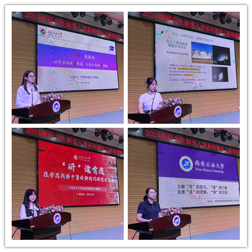 雁塔校區(qū)會(huì)場(chǎng)上,來(lái)自石油工程學(xué)院的博士羅開(kāi)慶以《仰望星空,腳踏實(shí)地——研究生科研規(guī)劃與方法實(shí)踐分享》為題,結(jié)合自身從碩士到博士的科研進(jìn)階經(jīng)歷,給同學(xué)們分享了科研實(shí)踐方法建議,希望學(xué)弟學(xué)妹們?cè)诳蒲袑W(xué)習(xí)中勤記錄、善總結(jié),并在此基礎(chǔ)上運(yùn)用“嫁接法”“轉(zhuǎn)移法”積極進(jìn)行科研創(chuàng)新探索。地球科學(xué)與工程學(xué)院博士章鑫以《讓思想落筆,讓創(chuàng)新落地:論文與專利的研途雙翼》為題,從思、構(gòu)、寫(xiě)三個(gè)方面分享了論文創(chuàng)作的思路和方法,并圍繞想、提、護(hù)三個(gè)關(guān)鍵詞為新生講解了如何進(jìn)行專利構(gòu)思、方案提煉以及創(chuàng)新落地。化學(xué)化工學(xué)院的碩士勇志華以《從“適應(yīng)”到“起跑”,解鎖論文、競(jìng)賽與科研生活新節(jié)奏》為題,結(jié)合自己的申博經(jīng)歷用4個(gè)優(yōu)先級(jí)給新生提出研究生科研學(xué)習(xí)生活的規(guī)劃建議,同時(shí)分享了他悉心整理的AI科研工具集。機(jī)械工程學(xué)院的碩士張伊晨以《科研競(jìng)賽齊驅(qū)并進(jìn),機(jī)械學(xué)子的突破與成長(zhǎng)》為題,分享了她參加科研競(jìng)賽的三個(gè)心法:作品選題、團(tuán)隊(duì)建設(shè)、展示表達(dá),總結(jié)出強(qiáng)大的技術(shù)加出色的表達(dá),將會(huì)助力競(jìng)賽的成功。