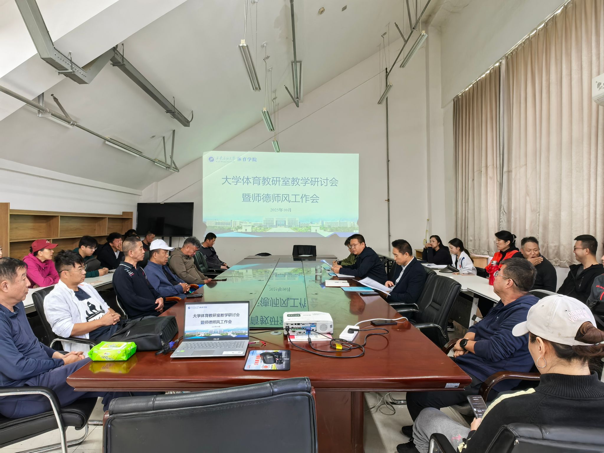 10月15日,體育學院在鄠邑校區(qū)學院會議室召開大學體育課程教學研討會暨師德師風工作會,本次教研活動主題為“筑牢師德師風,深化課程改革,提高課堂教學效率”。體育學院黨政領導劉小波、李壽邦、阮凌,大學體育教研室主任劉丹青和全體大學體育教研室教師參加會議。會議由體育學院副院長阮凌主持。