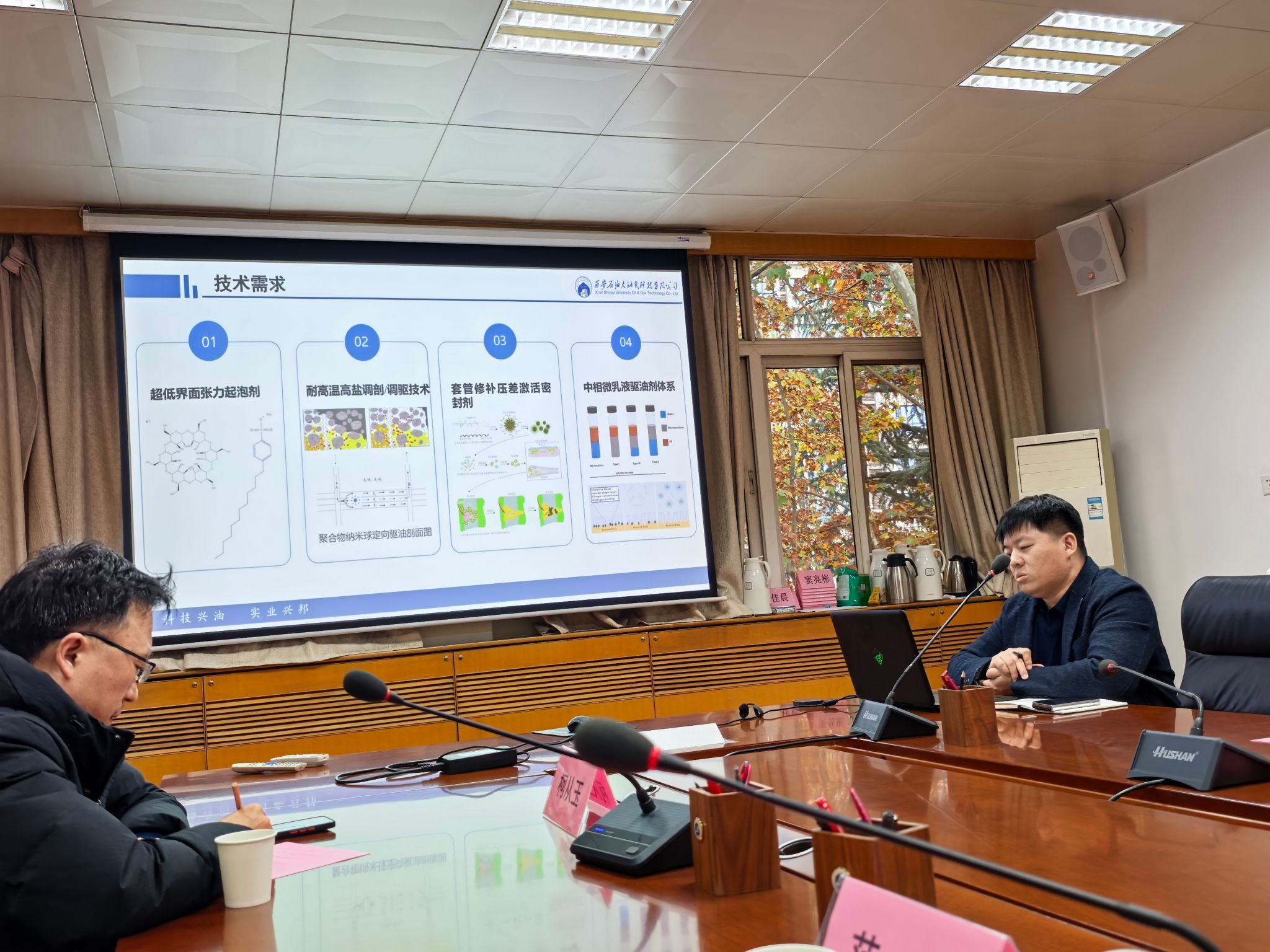 會上,李婷介紹了公司的基本情況,黃兆豐發(fā)布了公司的技術(shù)需求??聫挠?、陳世軍分別“中相微乳液驅(qū)油劑篩選優(yōu)化及性能評價(jià)”“高溫高鹽油藏調(diào)剖堵水技術(shù)”“長慶油田低滲/超低滲油藏超低界面張力起泡劑”為題對公司的技術(shù)需求進(jìn)行了揭榜匯報(bào)。隨后校企雙方就技術(shù)需求和研發(fā)方案細(xì)節(jié)進(jìn)行深入溝通交流。