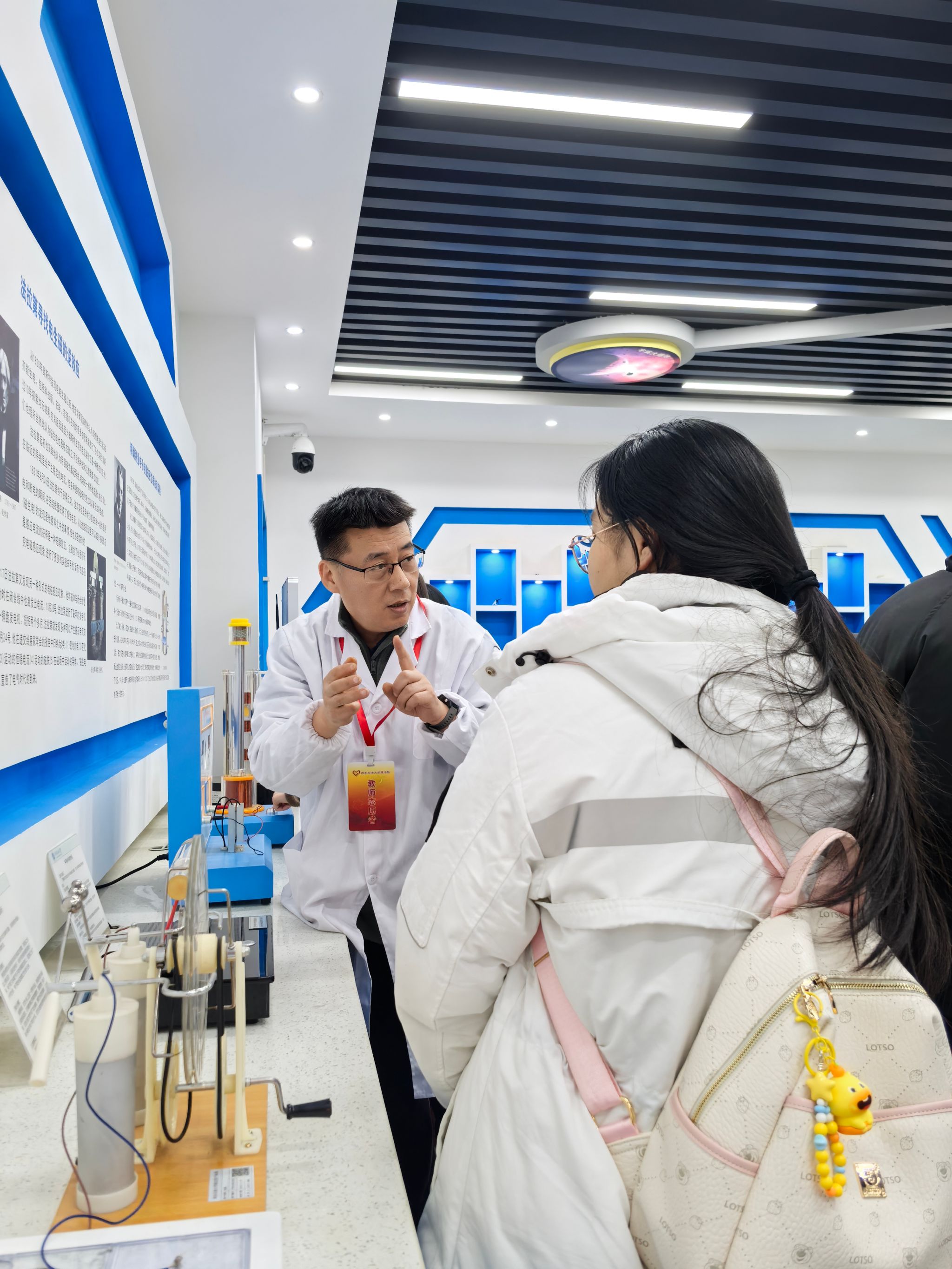 研學活動第二站來到理學院物理演示實驗室。物理演示實驗室是陜西省科普教育基地,是集圖像演示、實物操作等功能為一體的開放性實驗室,涵蓋了力學、電磁學、光學、熱學等方面知識。在理學院師生講解員的耐心講解和示范下,同學們依次參觀并親身體驗了一系列精彩的物理實驗。從靈巧的機械裝置,到神奇的電磁感應;從熱現(xiàn)象的微觀奧秘,到光和影的奇幻世界,每一個實驗都讓同學們驚嘆不已,深深感受到了物理世界的無窮魅力。這些精心設(shè)計的演示實驗,不僅激發(fā)了學生對物理學奧秘的好奇心與探索欲,更為大家搭建起了一座通往科學殿堂的橋梁,讓物理之美躍然眼前,深入人心。