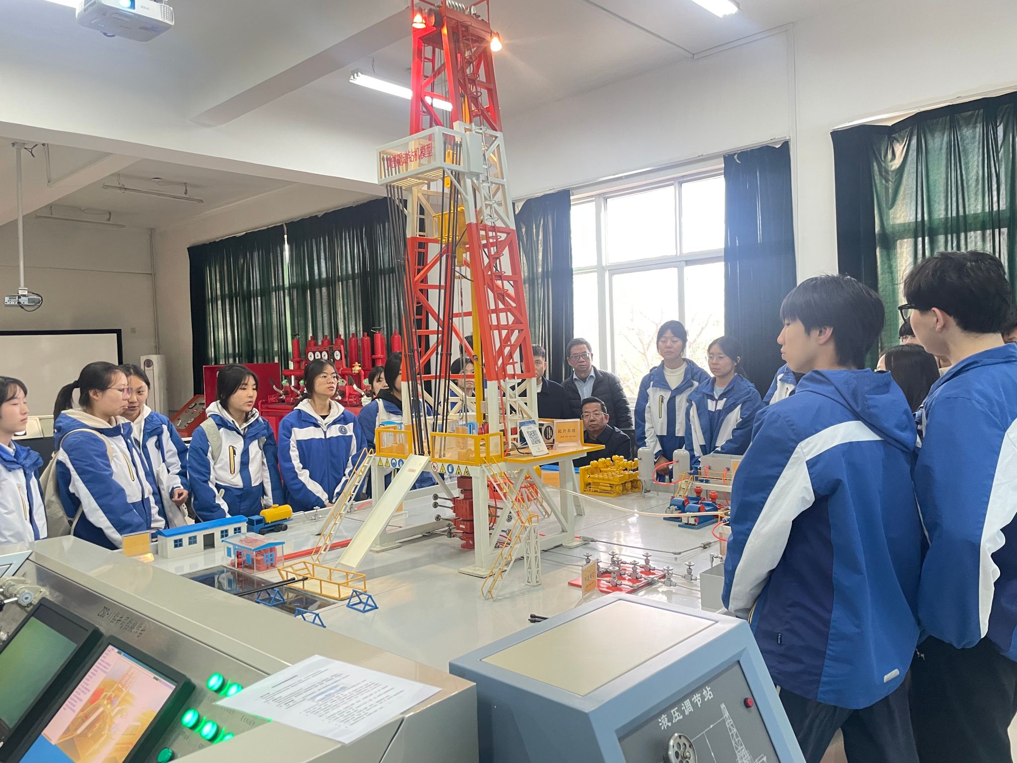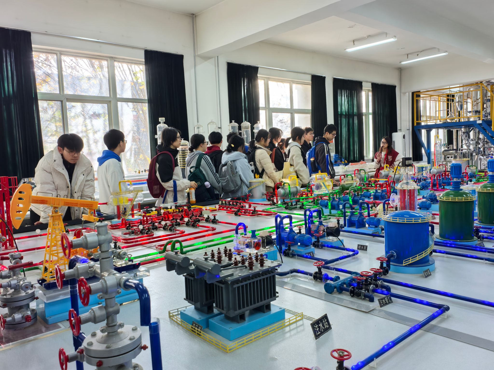 研學活動最后一站參觀了我校陜西省石油石化虛擬仿真實驗教學中心。在大學生講解員的帶領(lǐng)下,五高師生參觀了鉆井實訓室、地質(zhì)標本實訓室、采油實訓室、油氣分布沙盤、集輸、煉化實訓室、采油實訓室。通過參觀學習,學生初步了解了石油勘探、開采、煉化和運輸?shù)娜^程,近距離感受到了石油石化及地質(zhì)行業(yè)的魅力與挑戰(zhàn)。