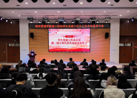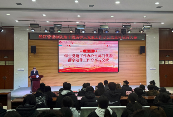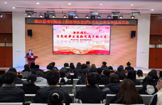 為深入貫徹習近平新時代中國特色社會主義思想,提升學生黨建工作人員履職能力,接續(xù)發(fā)揮先鋒模范作用,11月19日,經濟管理學院在鄠邑校區(qū)崇文樓118多功能廳舉行第十四屆學生黨建工作辦公室全體成員大會。經濟管理學院黨委副書記趙紀飛、學生工作辦公室副主任張碩、組織員曹萌,學生黨建工作辦公室指導老師王業(yè)林、學生黨建工作辦公室全體成員共180余人參會。