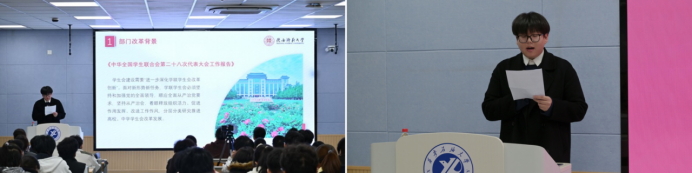 11月13日晚,培訓(xùn)第三講特邀陜西師范大學(xué)研究生會(huì)主席團(tuán)成員趙曉洋主講,他以“改革背景下的組織架構(gòu)與品牌賦能”為主題,解讀了在新形勢(shì)下堅(jiān)持黨的領(lǐng)導(dǎo)、深化學(xué)生會(huì)改革、堅(jiān)持從嚴(yán)治會(huì)的重要性與具體路徑,并結(jié)合陜西師范大學(xué)研究生會(huì)的實(shí)踐闡述了該模式在提升工作效率、促進(jìn)協(xié)同聯(lián)動(dòng)等方面的顯著成效。同時(shí)展示了陜西師范大學(xué)研究生會(huì)精心打造“我為同學(xué)做實(shí)事”的服務(wù)品牌矩陣,為我校學(xué)生會(huì)工作的品牌化建設(shè)提供了寶貴參考。