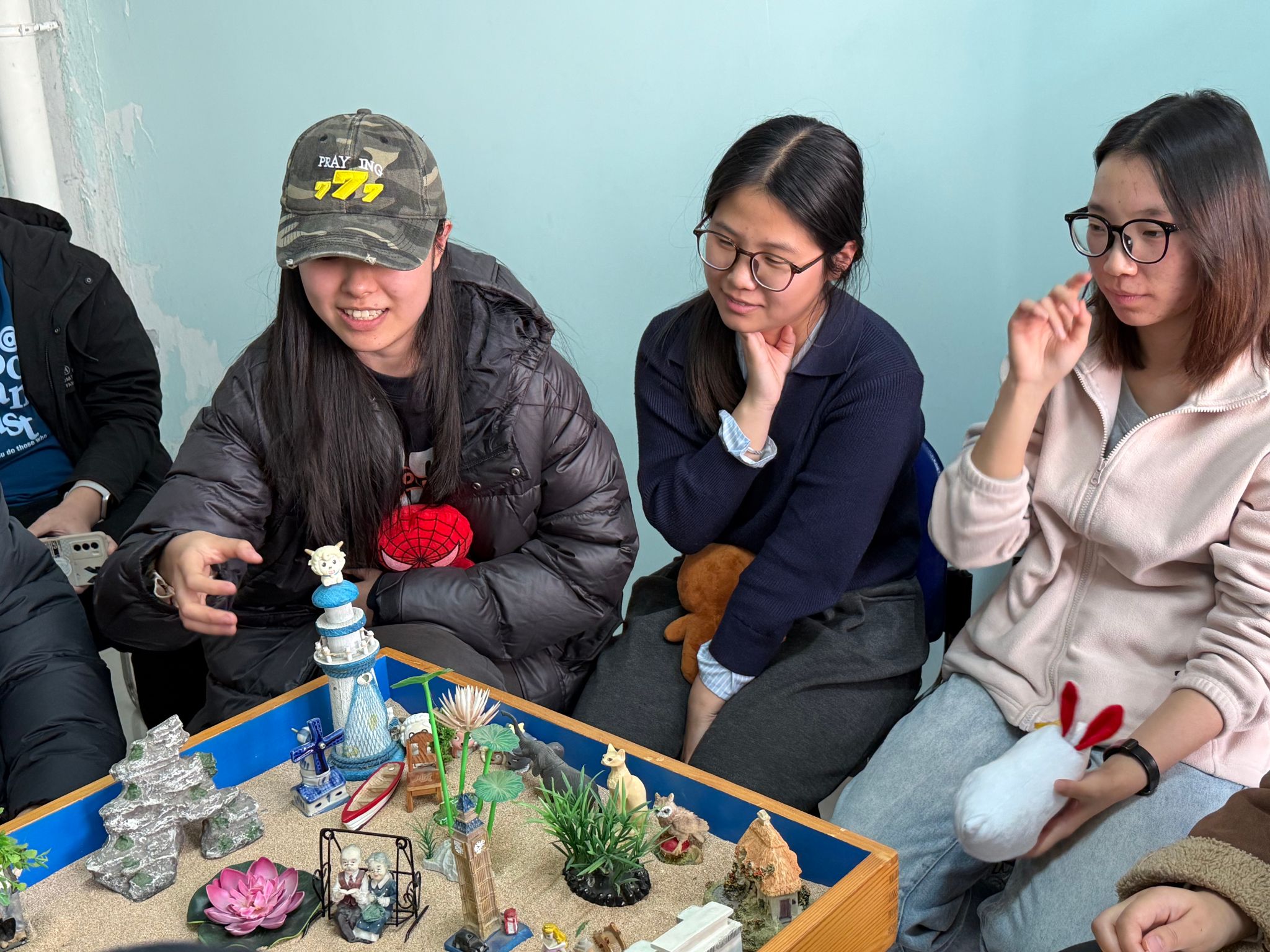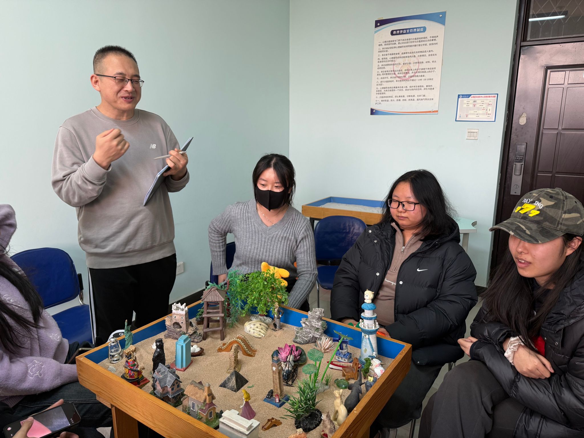 在沙盤心理測試與分享交流環(huán)節(jié),學(xué)生在閆老師的分組引導(dǎo)下走進(jìn)心理沙盤室。大家面對陳列架上涵蓋人物、建筑、自然、交通等多個類別的數(shù)百件沙具,暫時放下復(fù)習(xí)的疲憊,遵循內(nèi)心直覺挑選沙具,在特制沙盤內(nèi)通過堆沙、擺放道具等方式,構(gòu)建出專屬的“心理圖景”。過程中,心理老師全程跟進(jìn)觀察,細(xì)致記錄學(xué)子的沙具選擇順序、擺放位置及情緒變化,為后續(xù)的解讀交流積累基礎(chǔ)。