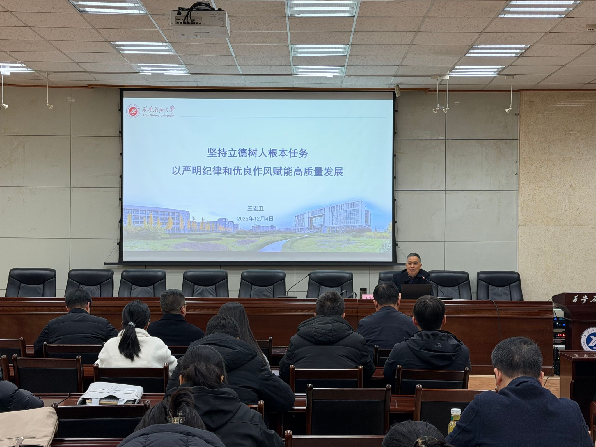 12月4日下午,管道工程學(xué)院黨委在雁塔校區(qū)西階第三會(huì)議室開展了“學(xué)黨章鑄忠誠(chéng),悟思想強(qiáng)使命”專題學(xué)習(xí)班第二講。本次課程由校紀(jì)委副書記王宏衛(wèi)講授,主題為“堅(jiān)持立德樹人根本任務(wù),以嚴(yán)明紀(jì)律和優(yōu)良作風(fēng)賦能高質(zhì)量發(fā)展”,學(xué)院全體教職工、研究生黨員代表共70余人參加學(xué)習(xí)。會(huì)議由學(xué)院黨委副書記高亮主持。