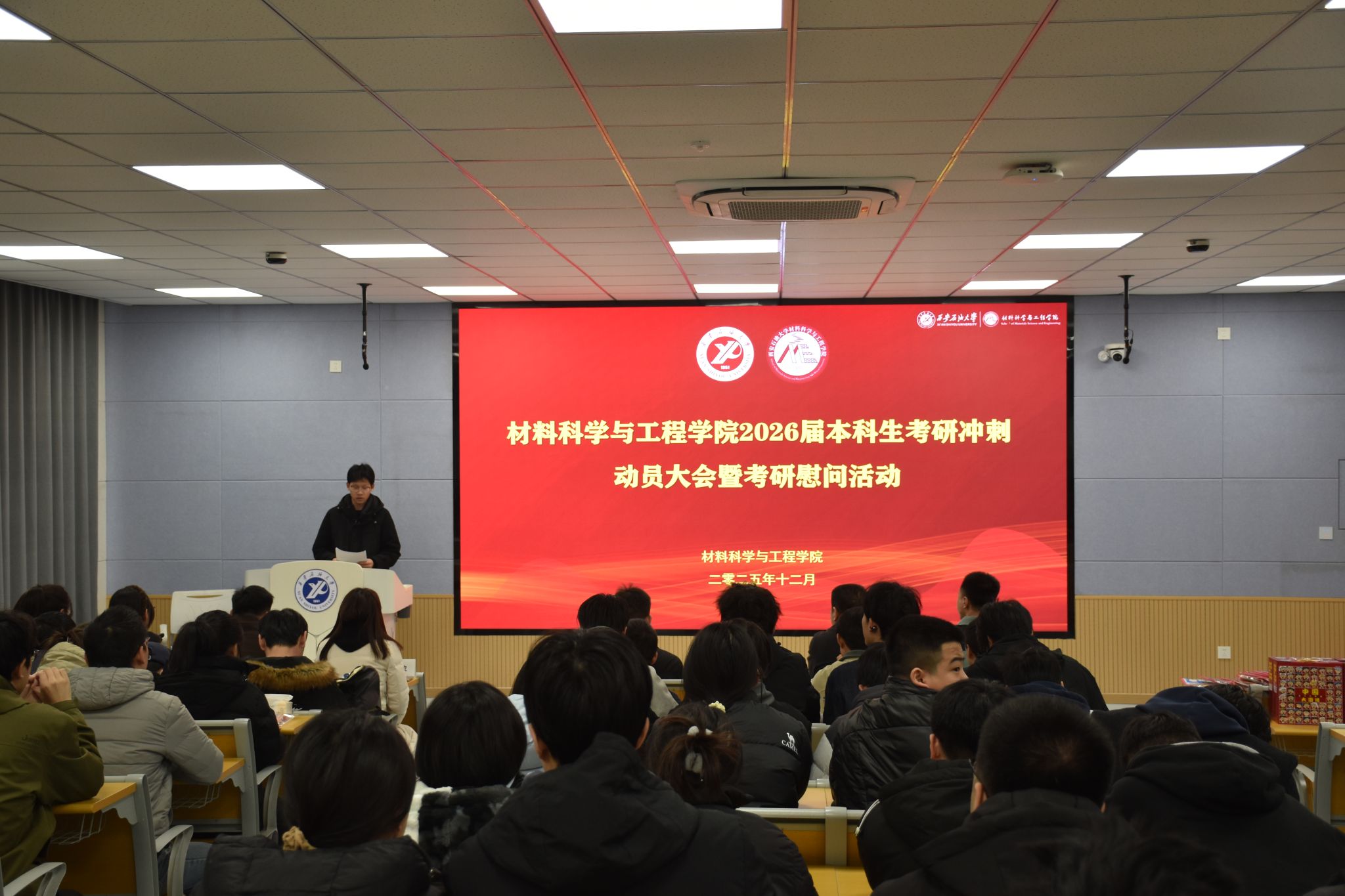 為深入貫徹“以生為本”育人理念,切實(shí)關(guān)懷考研學(xué)子備考狀態(tài),緩解備考壓力,增強(qiáng)迎考信心,124日,材料科學(xué)與工程學(xué)院在邑校區(qū)博覽樓110教室舉行2026屆本科生考研沖刺動(dòng)員大會暨考研慰問活動(dòng)。學(xué)院黨委書記耿嶺,黨委副書記屈敏佳,各年級輔導(dǎo)員和2026屆考研學(xué)生100余人參加活動(dòng)。活動(dòng)由學(xué)院學(xué)生工作辦公室副主任趙飛主持。