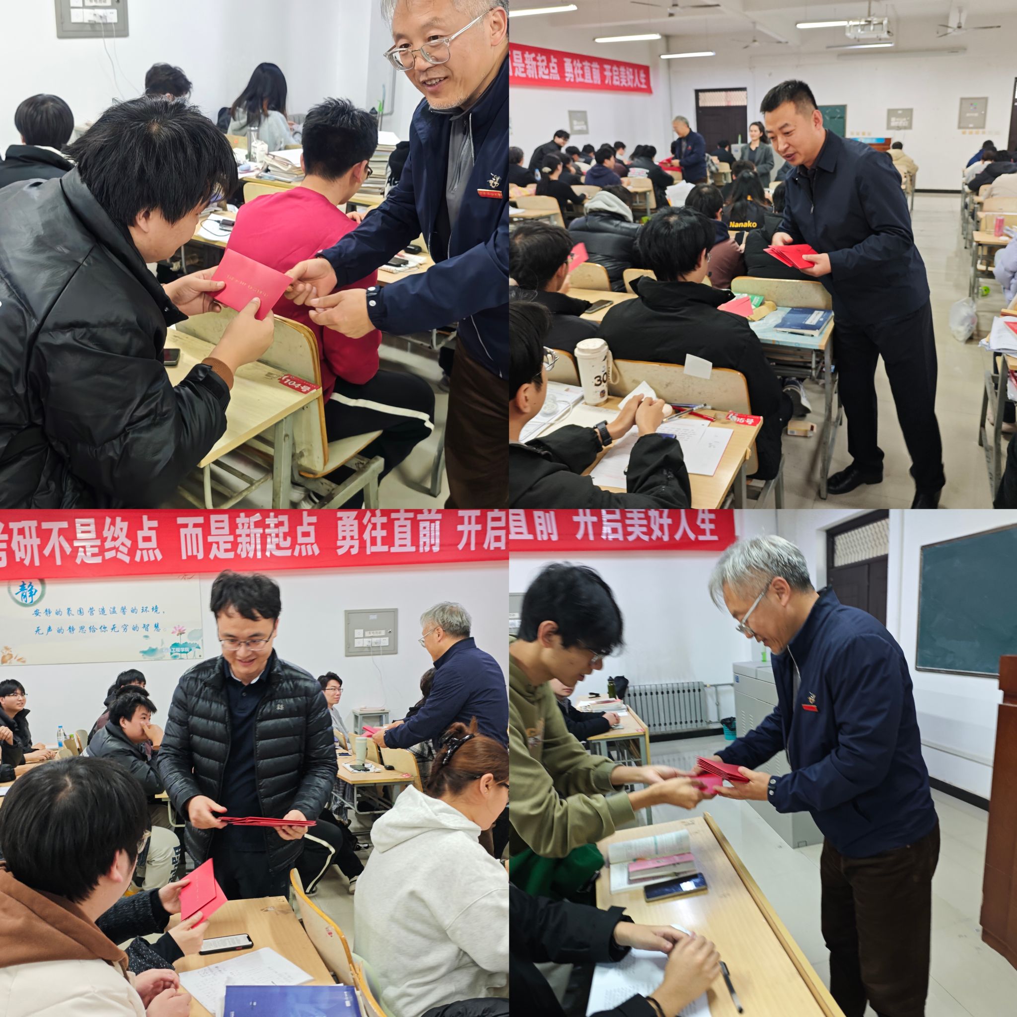 活動上,學院領(lǐng)導與老師們將飽含期許的禮物親手遞至備考學子手中,一封紅色信箋寄寓“鴻”運當頭之祝愿,封面“考研錦囊”字樣凝結(jié)智慧,封口處院徽如印,靜靜烙下學院的牽掛與囑托??紤]到考試期間通訊與用餐多有不便,學院特備暖心餐票,護航學子安心落筆,尤為珍貴的是,2026屆畢業(yè)班輔導員為每位考生親筆書寫信函,字里行間流淌真情,紙短情長蘊藏深意,讓溫暖的陪伴跨越考場內(nèi)外,成為每一位學子身后無聲卻堅實的港灣。