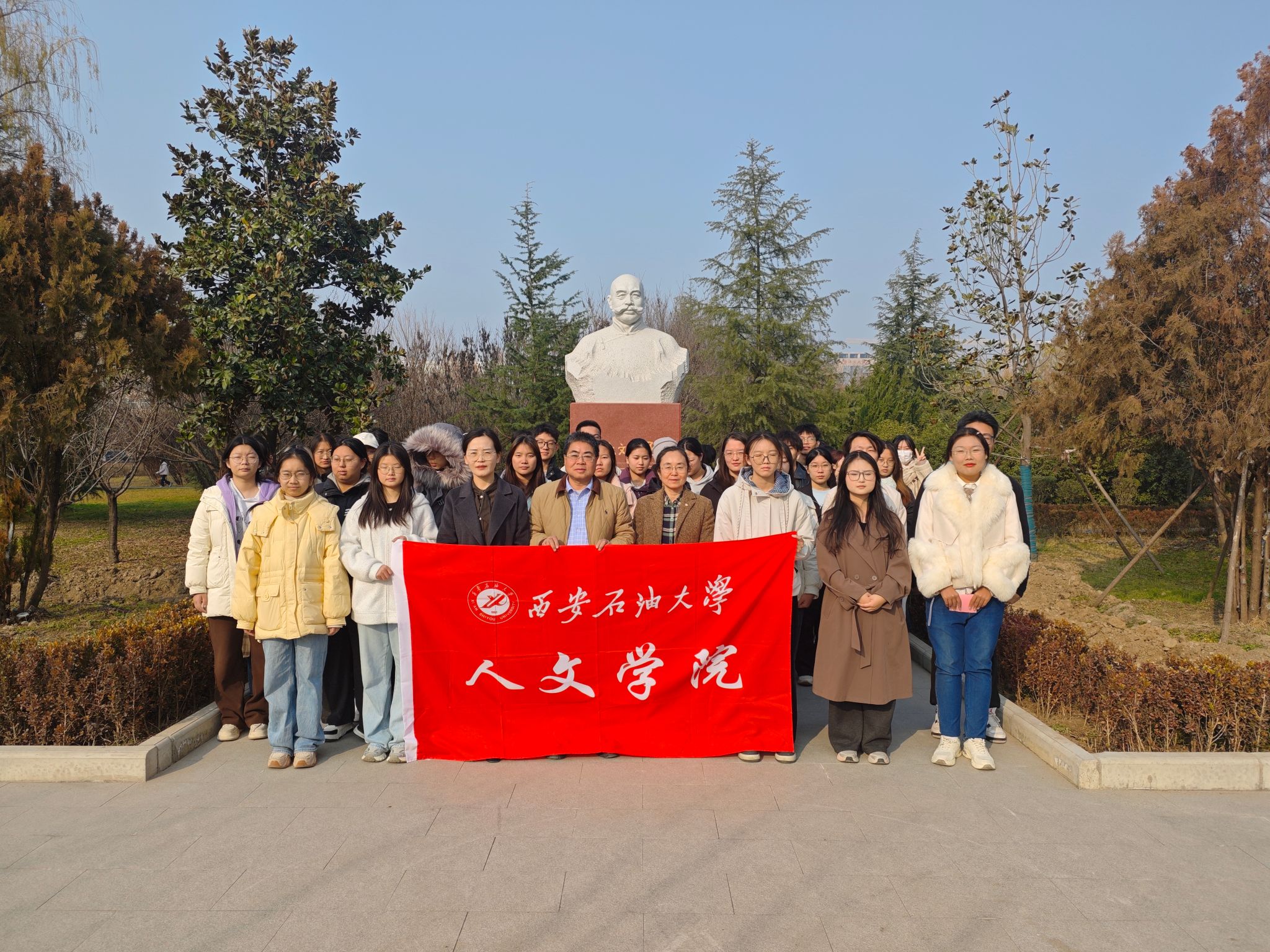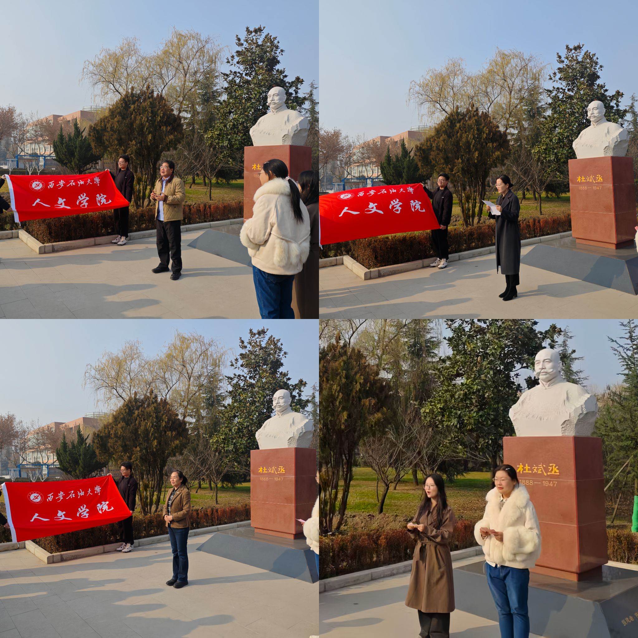 本次主題誦讀活動(dòng)是陜西省課程思政示范課“詩詞創(chuàng)作與吟誦”課的教學(xué)實(shí)踐活動(dòng),目的是讓同學(xué)們?cè)谙荣t精神的浸潤下,實(shí)現(xiàn)專業(yè)學(xué)習(xí)與課程思政的深度融合。杜斌丞雕像是校園文化新地標(biāo),更是愛國主義教育的重要場所。此次教學(xué)實(shí)踐活動(dòng)的開展,以詩為媒、以聲傳情,深切緬懷學(xué)校辦學(xué)的重要奠基人之一杜斌丞先生,以弘揚(yáng)其愛國精神與教育家情懷。