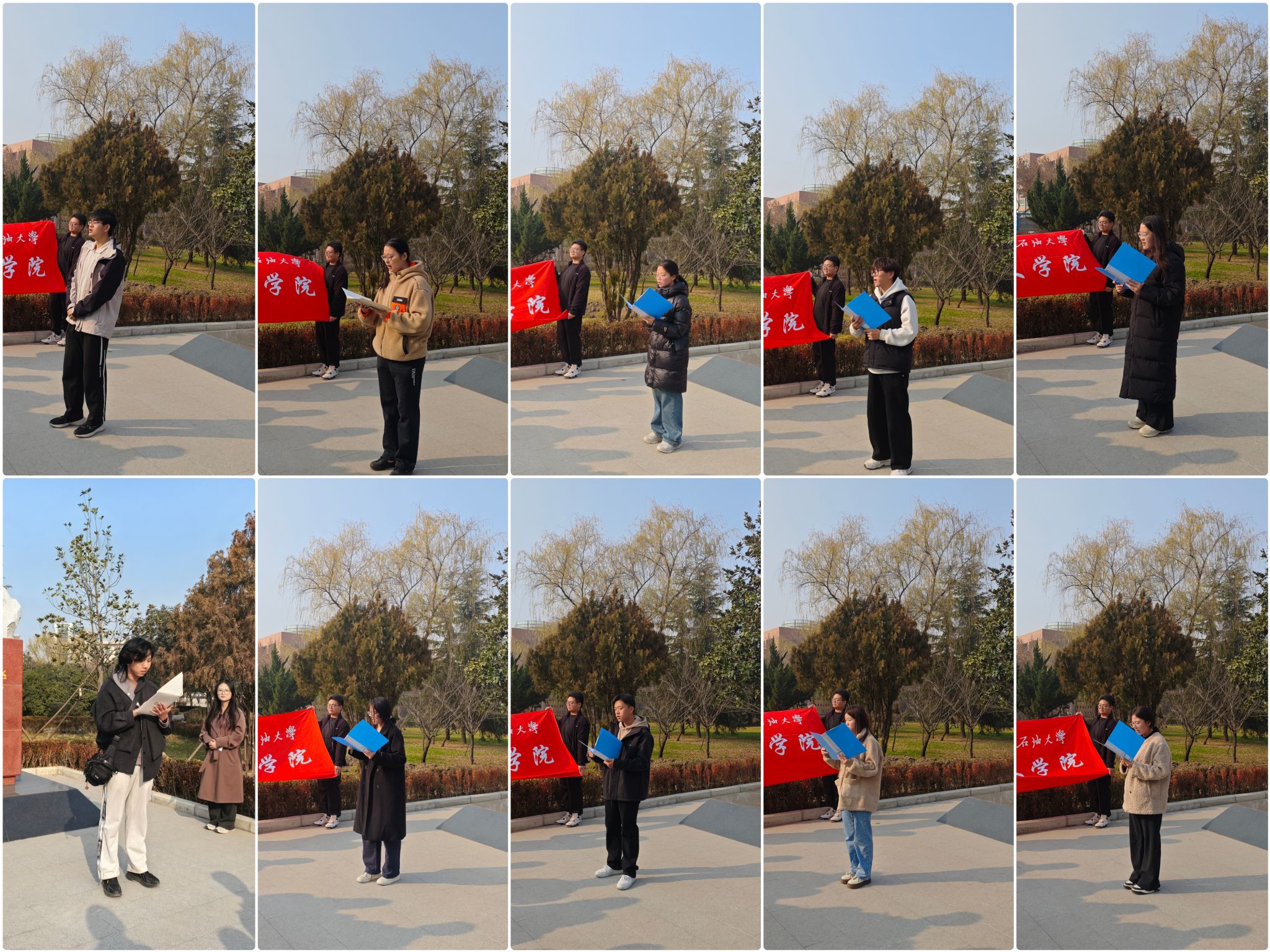 在誦讀環(huán)節(jié),來自中文2401班的石浩然、路斯洋、張?zhí)炀?、袁清泉、韓景怡、寧熙典,以及中文2402班的姜丁楠、馬璟澤、董資昕、劉思雨等10位同學(xué)依次登臺(tái),用飽含深情的語調(diào)朗誦自己創(chuàng)作的主題詩歌。同學(xué)們的作品或追憶先生榆林辦學(xué)的艱辛歷程,或贊頌其面對(duì)獨(dú)裁勢(shì)力的錚錚鐵骨,或抒發(fā)傳承先生精神的青春誓言,字字鏗鏘、句句肺腑,將對(duì)革命先輩的崇敬之情化作回蕩在雕像周圍的真摯聲浪,讓在場師生深受感染。