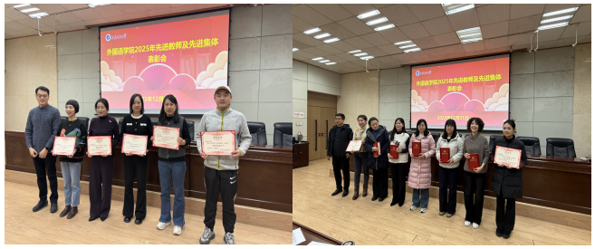 在述職述廉會(huì)議之后,學(xué)院召開2025年先進(jìn)教師和先進(jìn)集體的表彰大會(huì),陳武宣讀了《外國(guó)語(yǔ)學(xué)院關(guān)于公布2025年度先進(jìn)教師及先進(jìn)集體評(píng)選結(jié)果的通知》,對(duì)在教育教學(xué)、科學(xué)研究、人才培養(yǎng)、管理服務(wù)等工作中表現(xiàn)突出的4個(gè)先進(jìn)集體和29名先進(jìn)教師予以隆重表彰。學(xué)院黨政領(lǐng)導(dǎo)和工會(huì)主席為獲獎(jiǎng)集體與個(gè)人頒發(fā)榮譽(yù)證書,陳武向受表彰的先進(jìn)集體和先進(jìn)教師表示熱烈祝賀,他們身上愛崗敬業(yè)、甘于奉獻(xiàn)的精神,值得全體教師學(xué)習(xí)借鑒,全體教師要以先進(jìn)為標(biāo)桿、以榜樣為力量、主動(dòng)對(duì)標(biāo)看齊,為學(xué)院發(fā)展貢獻(xiàn)自己的力量。