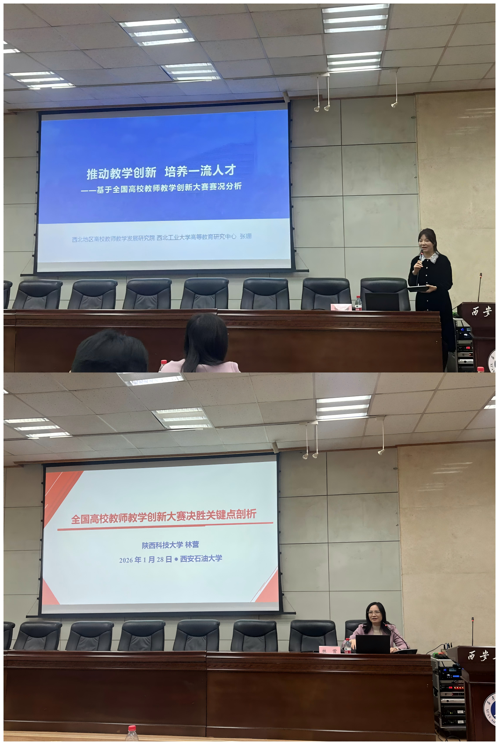 隨后,兩場專題報告為在場教師帶來了前沿教學(xué)創(chuàng)新思路。西北工業(yè)大學(xué)張珊老師以《推動教學(xué)創(chuàng)新 培養(yǎng)一流人才—基于全國高校教師教學(xué)創(chuàng)新大賽賽況分析》為題,結(jié)合全國賽事最新動態(tài),深入剖析了當(dāng)前教學(xué)創(chuàng)新的趨勢與方向,用鮮活案例展現(xiàn)了創(chuàng)新教學(xué)對人才培養(yǎng)的賦能作用;陜西科技大學(xué)林營教授作為全國高校教師教學(xué)創(chuàng)新大賽一等獎獲得者,以《全國高校教師教學(xué)創(chuàng)新大賽決勝關(guān)鍵點剖析》為主題,從參賽材料打磨、課堂教學(xué)設(shè)計、成果展示技巧等核心環(huán)節(jié)入手,分享了備賽過程中的實戰(zhàn)經(jīng)驗與避坑指南,為教師們精準(zhǔn)發(fā)力提供了寶貴借鑒。