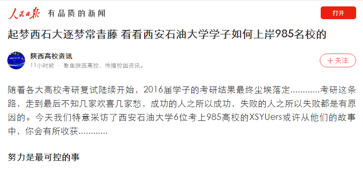 經(jīng)驗(yàn)總結(jié):這次難忘的復(fù)試經(jīng)歷讓我收獲了很多,也反思了很多。在我看來,能夠支撐我走到最后的優(yōu)勢是相比常人更為豐富的實(shí)踐經(jīng)驗(yàn):大一到大三這幾年,在黨委宣傳部新媒體中心為官微撰寫推文的經(jīng)歷讓我熟練掌握了新媒體公眾號(hào)的運(yùn)營技能。得益于官微的平臺(tái)之大,我還有幸參加了陜西省省級(jí)的新媒體沙龍交流會(huì),進(jìn)一步學(xué)習(xí)到了高校自媒體的運(yùn)營策略,這也直接助推了我的b站影視頻道“-Funtime-”的誕生,讓我對(duì)媒體的運(yùn)營有了更加深切的體驗(yàn)。另外,大三下半學(xué)期我開始了在“騰訊大秦網(wǎng)”為期兩個(gè)月的實(shí)習(xí),為“吃貨在西安”、“西安種草機(jī)”撰寫美食、旅游類稿件。這所有的經(jīng)歷都讓我對(duì)新聞學(xué)的實(shí)踐更加得心應(yīng)手,同時(shí)也產(chǎn)生了更加深度的熱愛。