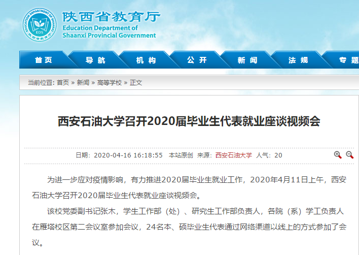 【省教育廳】西安石油大學(xué)召開2020屆畢業(yè)生代表就業(yè)座談視頻會(huì)