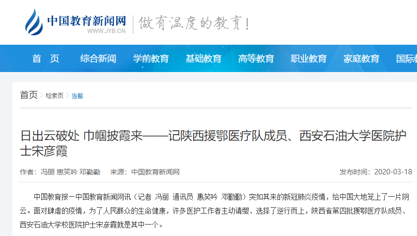 中國教育報—中國教育新聞網(wǎng)訊(記者 馮麗 通訊員 惠笑吟 鄧勤勤)突如其來的新冠肺炎疫情,給中國大地籠上了一片陰云。面對肆虐的疫情,為了人民群眾的生命健康,許多醫(yī)護工作者主動請纓、選擇了逆行而上,陜西省第四批援鄂醫(yī)療隊成員、西安石油大學校醫(yī)院護士宋彥霞就是其中一個。
