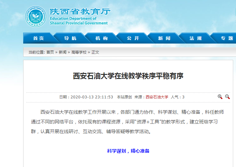 ——方案先行。學(xué)校出臺《西安石油大學(xué)疫情防控期間本科教學(xué)工作方案》《西安石油大學(xué)疫情防控期間本科在線教學(xué)工作方案》《西安石油大學(xué)疫情防控期間本科在線教學(xué)工作預(yù)案》等,從組織領(lǐng)導(dǎo)、教學(xué)準(zhǔn)備、教學(xué)實施、質(zhì)量保障等方面提出要求,全力保障疫情防控期間本科生教學(xué)工作的有序開展和線上教學(xué)質(zhì)量的持續(xù)改進(jìn)。