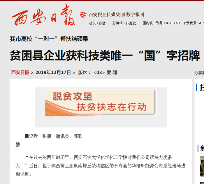 【西安日?qǐng)?bào)】西安石油大學(xué)“一對(duì)一”幫扶結(jié)碩果貧困縣企業(yè)獲科技類唯一“國(guó)”字招牌