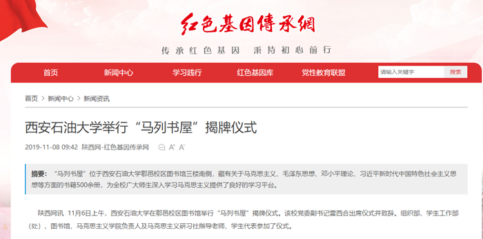 11月6日,西安石油大學舉行“馬列書屋”揭牌儀式。該校黨委副書記雷西合出席儀式并致辭。組織部、學生工作部(處)、圖書館、馬克思主義學院負責人及馬克思主義研習社指導老師、學生代表參加了儀式。