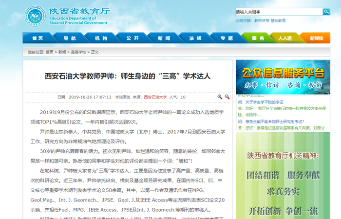 2019年9月份公布的ESI數(shù)據(jù)庫顯示,西安石油大學老師尹帥的一篇論文成功入選地質(zhì)學領(lǐng)域TOP1%高被引論文,一年內(nèi)被引頻次達到9次。