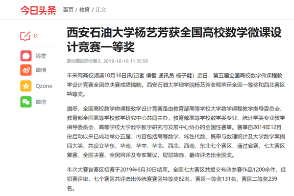 【今日頭條】西安石油大學(xué)楊藝芳獲全國(guó)高校數(shù)學(xué)微課設(shè)計(jì)競(jìng)賽一等獎(jiǎng)