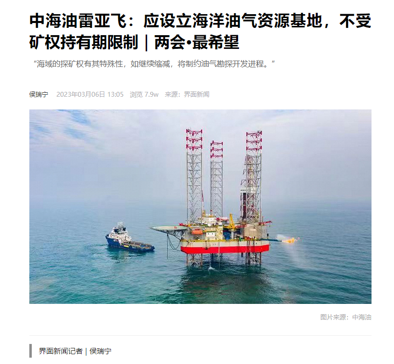 2 界面新聞:中海油雷亞飛:應設立海洋油氣資源基地,不受礦權持有期限制