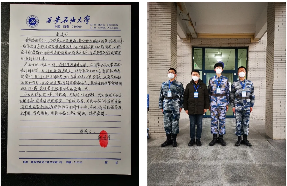 在結(jié)束讓人內(nèi)心震撼的元旦升旗的旗手任務(wù)之后,張峻宇繼續(xù)奔赴學(xué)校一線(xiàn),參與了由退伍大學(xué)生組成的“學(xué)生疫情防控糾察隊(duì)”,不知疲倦地奉獻(xiàn)著自己。“我們要對(duì)得起身上的這身禮服,對(duì)得起自己宣誓的那面國(guó)旗,對(duì)得起自己‘護(hù)我國(guó)旗,壯我國(guó)威’的誓言?!庇辛诉@誓言,天再冷,病毒再可怕,我們都始終相信,西石大必勝,西安必勝。
