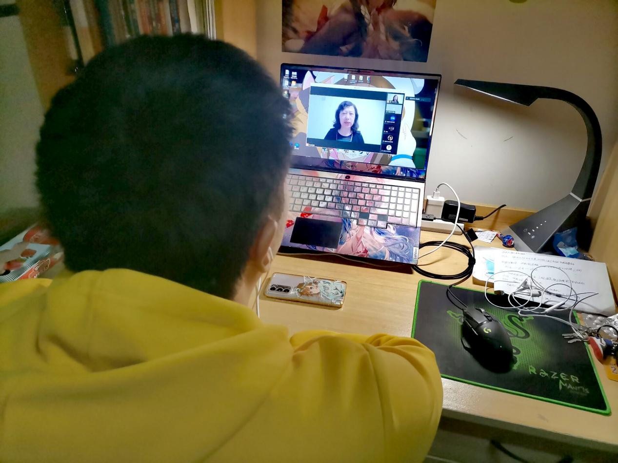 再次,上課等待中放一曲舒緩音樂,開始上課后黨老師先開視頻幾分鐘,讓學生看到真實的老師,和善溫暖地和學生交流幾句,拉近和學生的距離,然后進入共享PPT講授。
