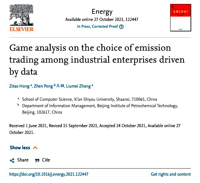計(jì)算機(jī)學(xué)院電子信息(計(jì)算機(jī)技術(shù))專業(yè)碩士研究生洪子濤同學(xué)、導(dǎo)師張留美副教授和北京石油化工學(xué)院彭珍教授共同合作撰寫的論文《Game analysis on the choice of emission trading among industrial enterprises driven by data》,日前收到國(guó)際SCI期刊《Energy》的論文錄用接收函,并已完成對(duì)該論文樣稿的校對(duì),在該期刊網(wǎng)上上線。據(jù)悉,《Energy》是由英國(guó)佩加蒙愛思唯爾科學(xué)有限公司出版,是能源動(dòng)力領(lǐng)域國(guó)際Top期刊,目前影響因子7.147。在中國(guó)科學(xué)院文獻(xiàn)情報(bào)中心期刊分區(qū)表中(2020年12月最新升級(jí)版),屬于一區(qū)刊物。