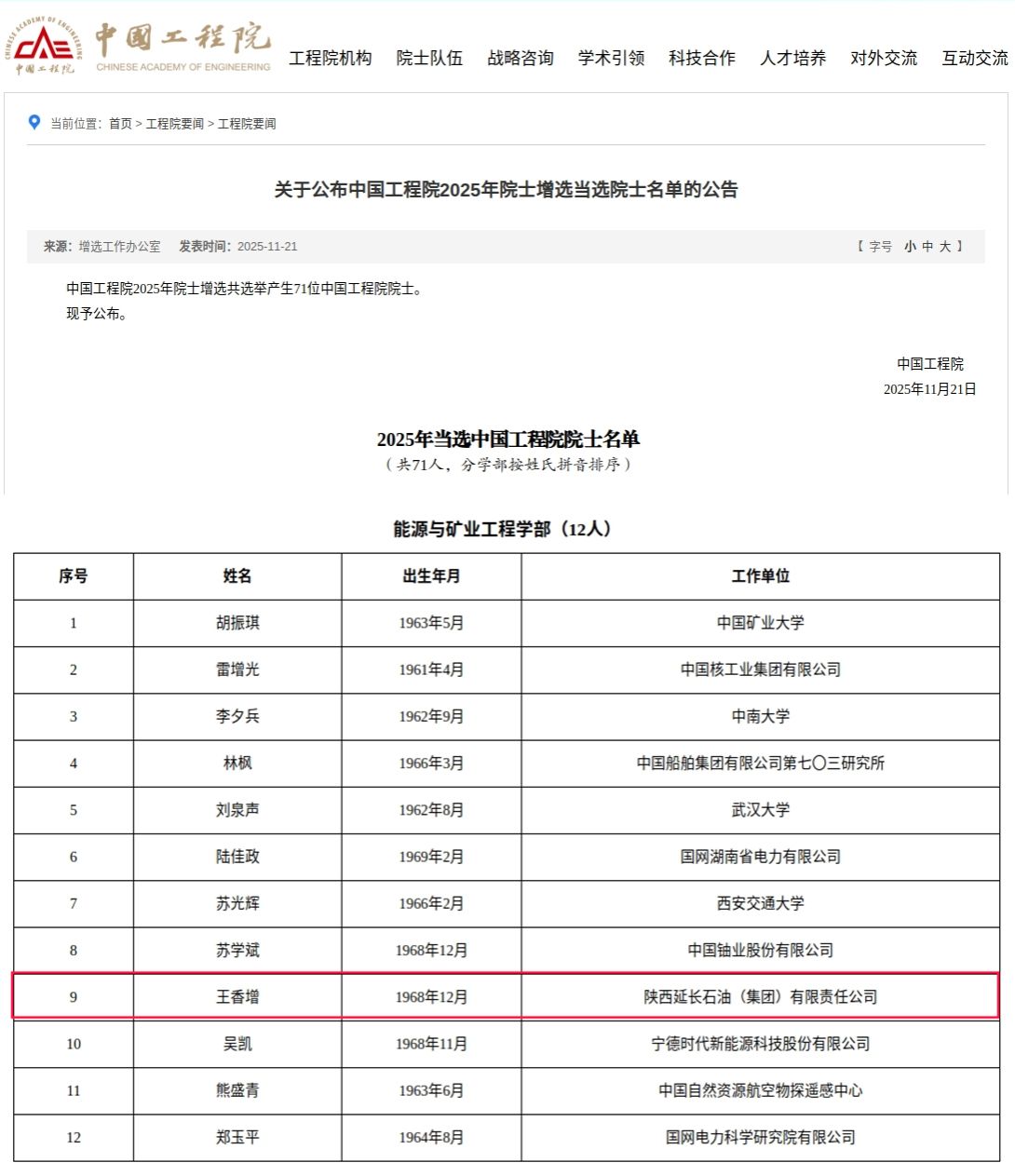 11月21日,中國工程院2025年院士增選結(jié)果正式揭曉,共選舉產(chǎn)生71位中國工程院院士,其中,能源與礦業(yè)工程學部新增院士12人,我校85級校友、碳中和未來技術(shù)研究院院長王香增當選。